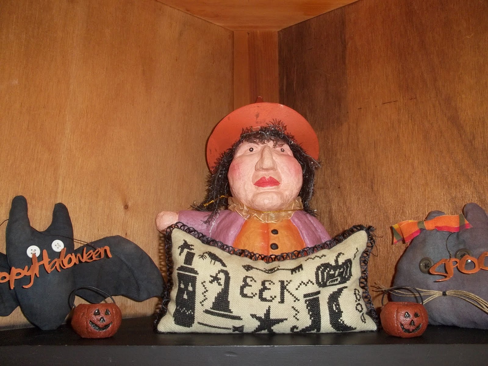 Maybe I should have taken a closer picture of it. Its really cute. Here is a picture of the whole cabinet with some of my Halloween stitching and decorating.