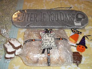 I just finished putting this cutie together. I have to laugh when I read it. I just love the saying. I have included it in a package for someone special for Halloween. (My son) he doesn't read my blog because he is SOOOOO busy at work so I know he won't see this. He just got his own office at work and he is so very excited about this new job. We are so very happy for him. So since he won't be home for Halloween I am sending him this little Halloween treat package to his job. I have included the stitching and a package of his favorite cookies. Also, some candy from his favorite store near by. I hope he gets a kick out of it.