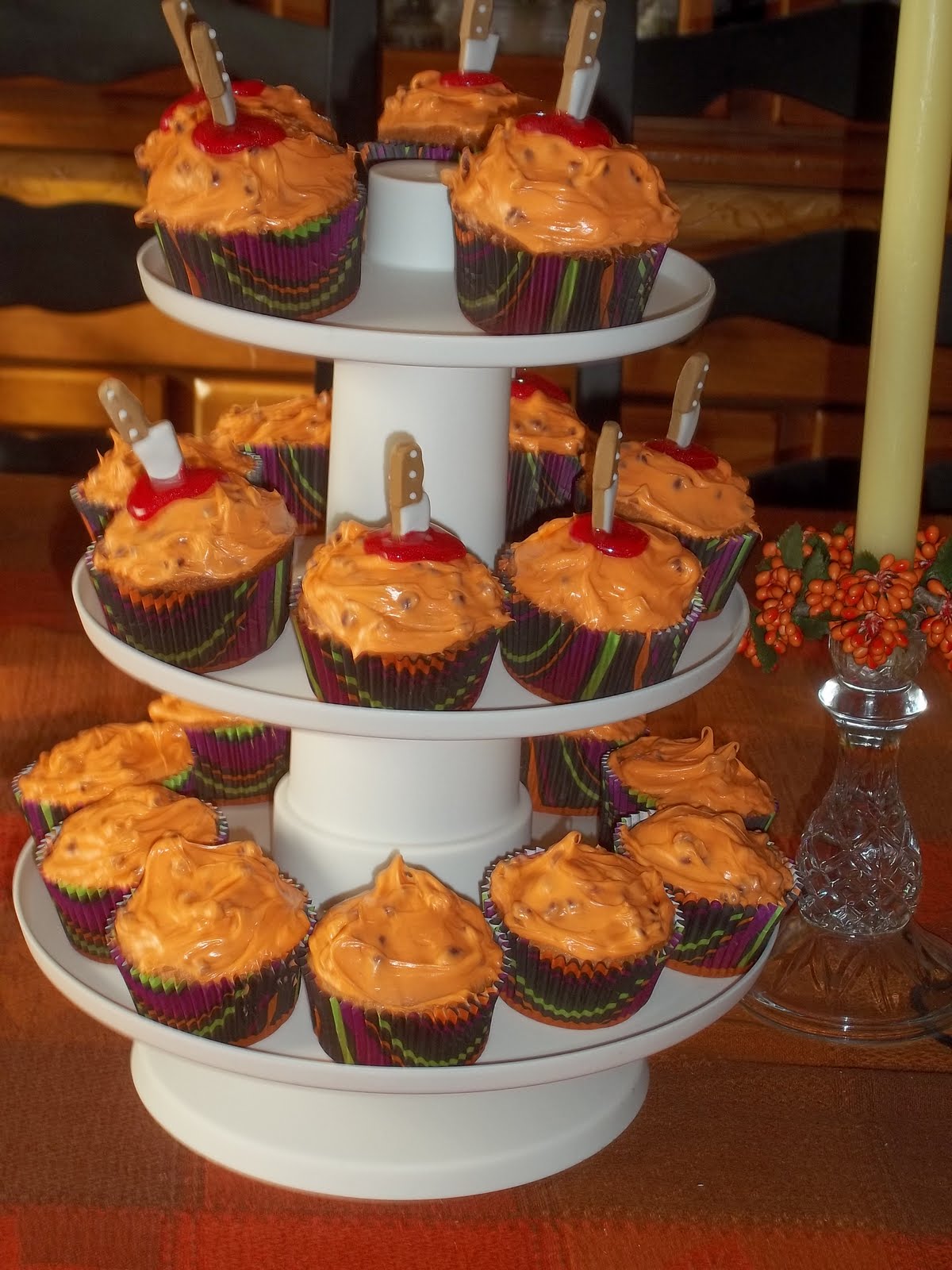 Halloween is over and I realized I never shared these pics with you. Those Cupcakes were delicious even if they were a bit creepy. The frosting was filled with mini chocolate chips which made them even better.